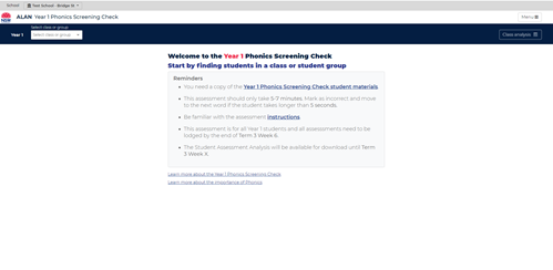 - In the ALAN homepage, select the Year 1 Phonics Screening Check tile.