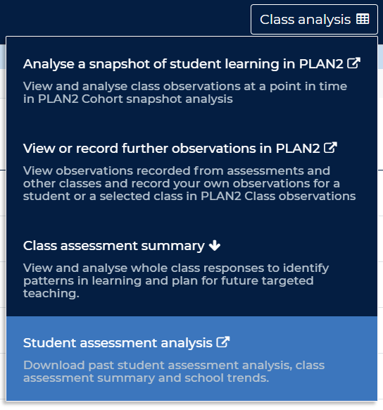 - Access the School trends statistics page by selecting Student assessment analysis from the Class analysis menu.