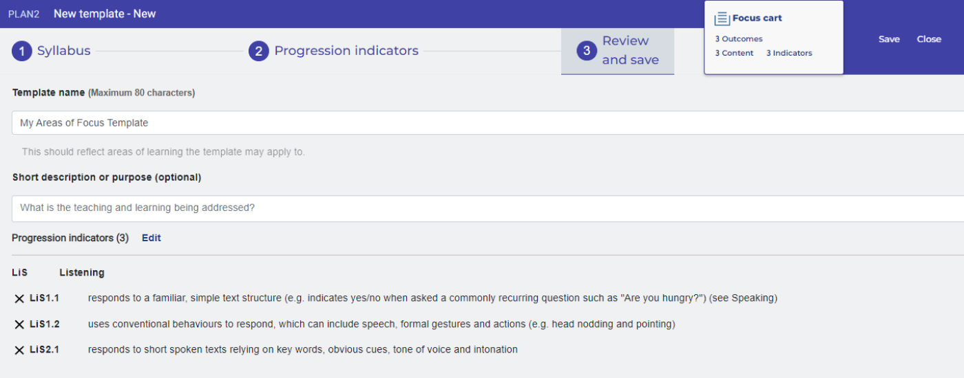 - In the ‘Review and save’ screen you will see the list of syllabus outcome(s) and progression indicator(s) that you selected in the previous steps.