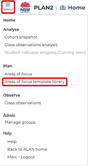 - From the menu (three horizontal lines in the top left corner), select ‘Areas of focus template library’.