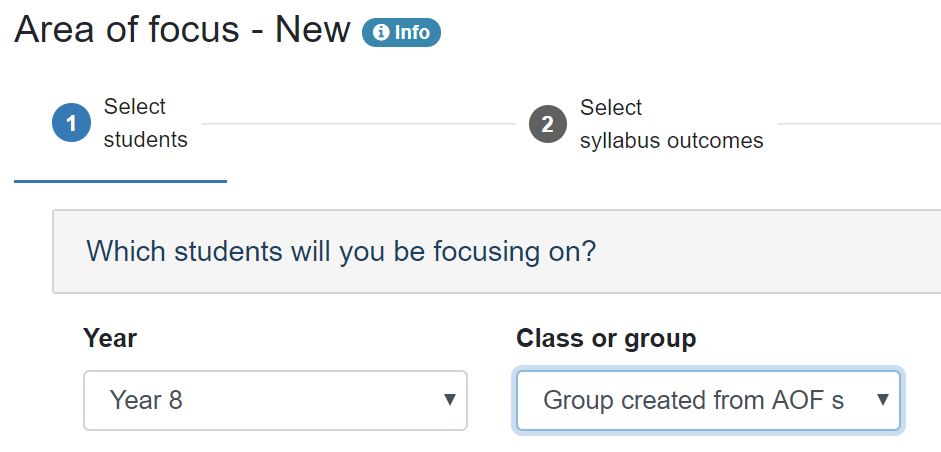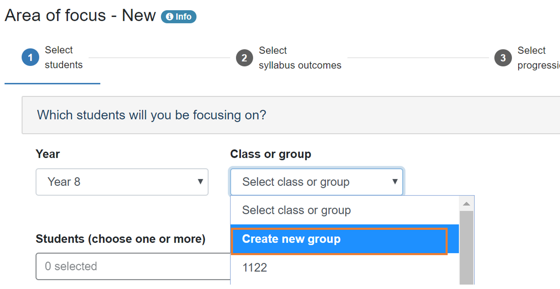 - After saving, the 'New student group' pop-up screen will close and you will see the ‘Area of focus - New’ screen again with your newly created student group selected in the Class or group field.