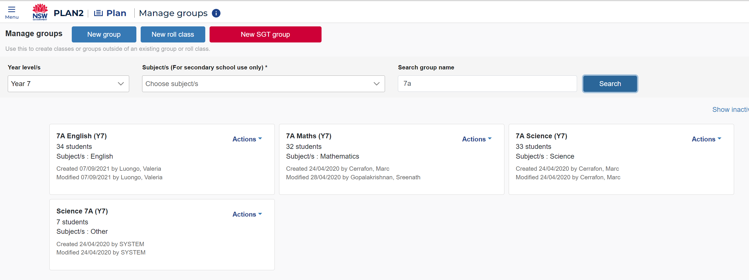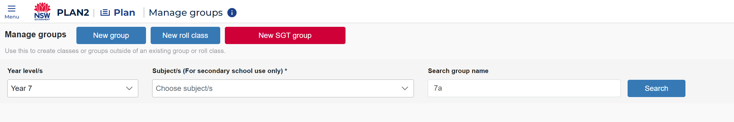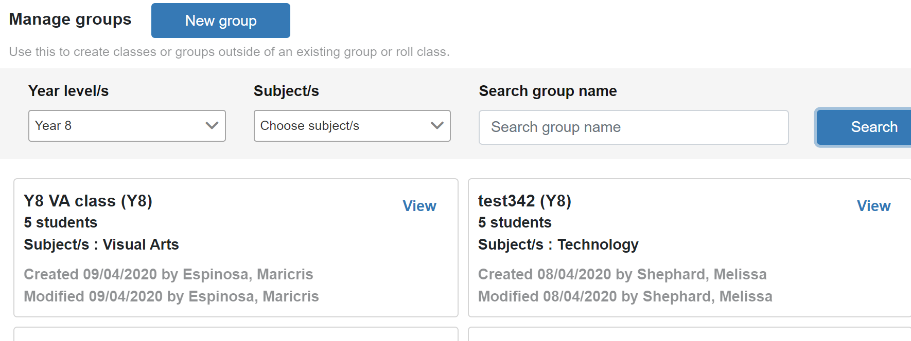 - You can search for an existing student group by Year level, Subject or Group name. Click the Search button to view the search results.