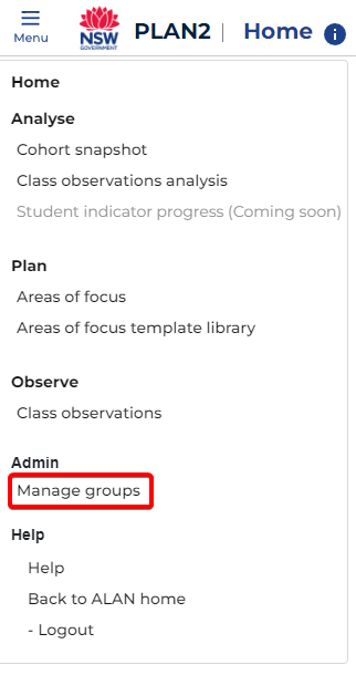- In PLAN2, click the menu (three horizontal lines in the top left corner), then select 'Manage groups'.