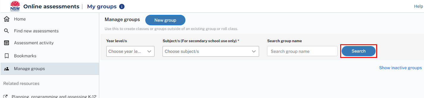 - You can search for an existing student group by Year level, Subject or Group name. Click the Search button to view the search results.