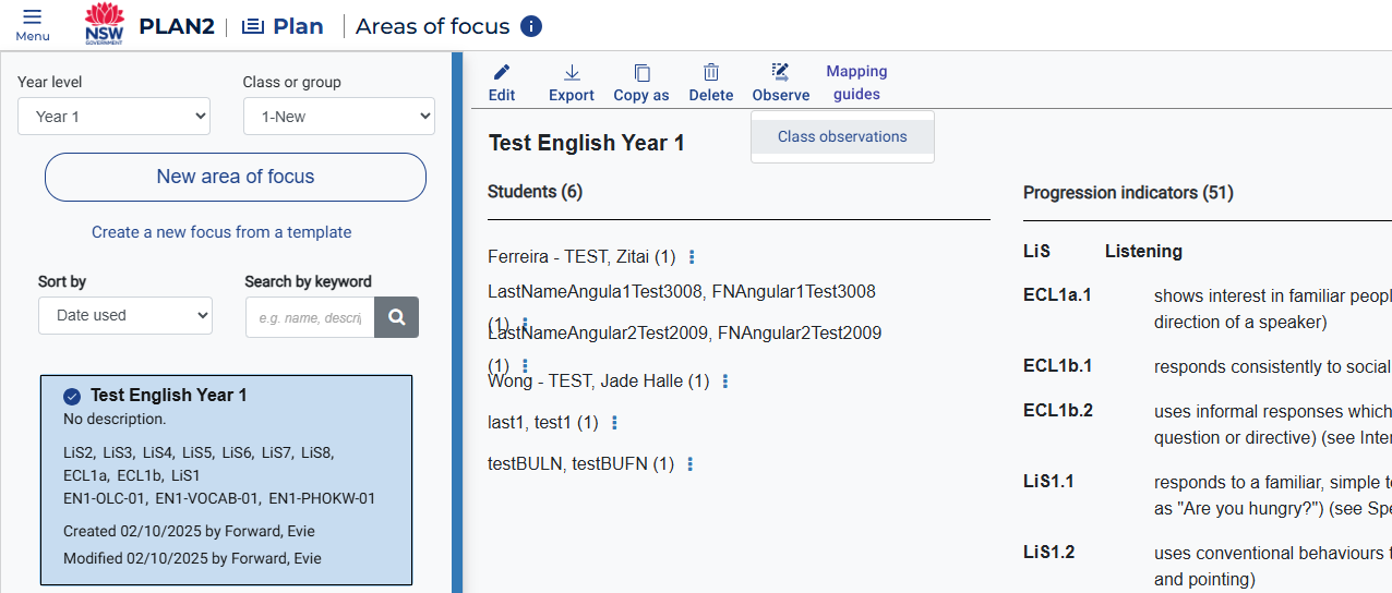 Areas of focus allows teachers to create and save a customised set of syllabus outcomes and progression indicators for a select group of students, to use for explicit teaching of literacy and numeracy across the curriculum and to monitor students’ learning in PLAN2.