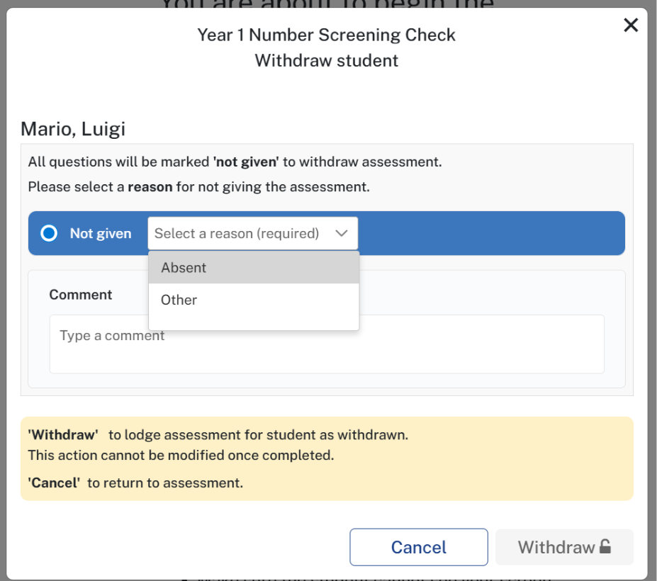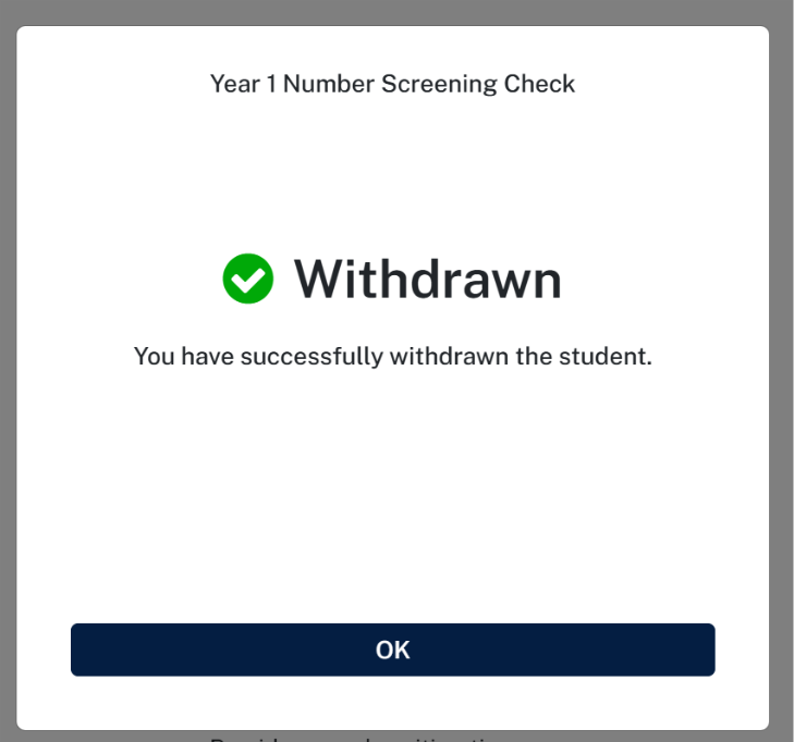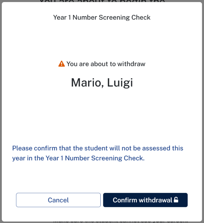 Students who are unable to participate in the Year 1 Number Screening Check can be withdrawn from the assessment.